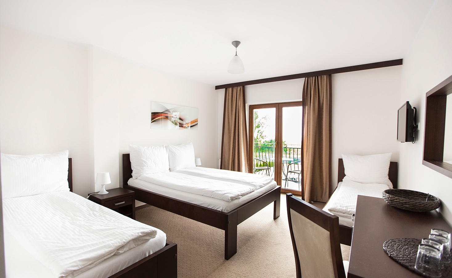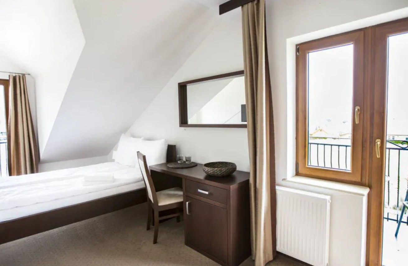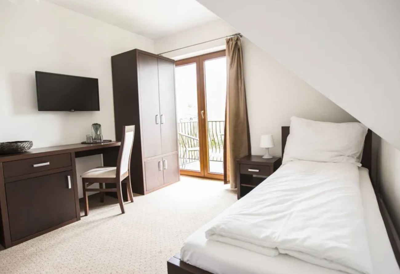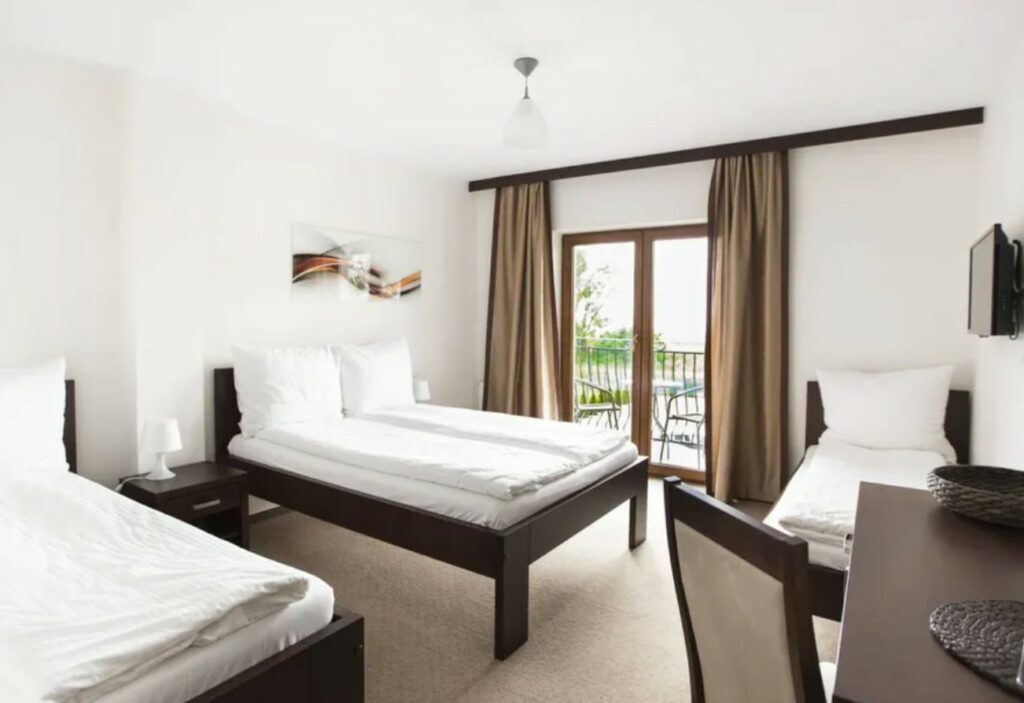 Pokoje trzyosobowe to komfortowa przestrzeń dla rodzin i małych grup, wyposażona w łóżko dwuosobowe oraz łóżko jednoosobowe, a także prywatną łazienkę. Oferują balkon i wygodę zarówno na krótki, jak i dłuższy pobyt.
